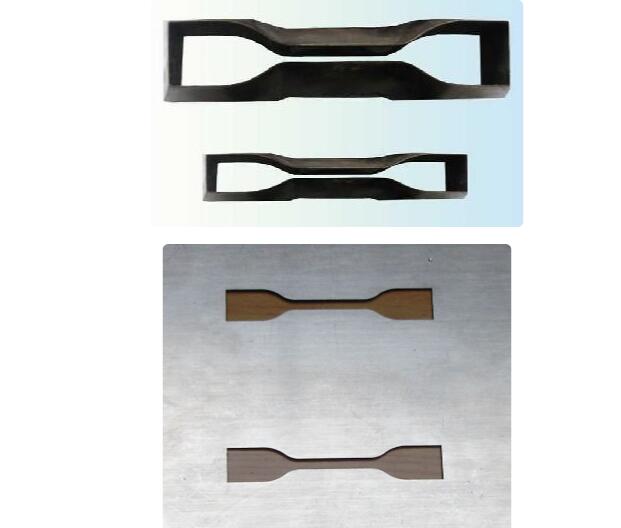 將準備好的裁刀放在需試片上,再放入沖壓設(shè)備中進行沖壓,啞鈴型樣品就這樣做好了。