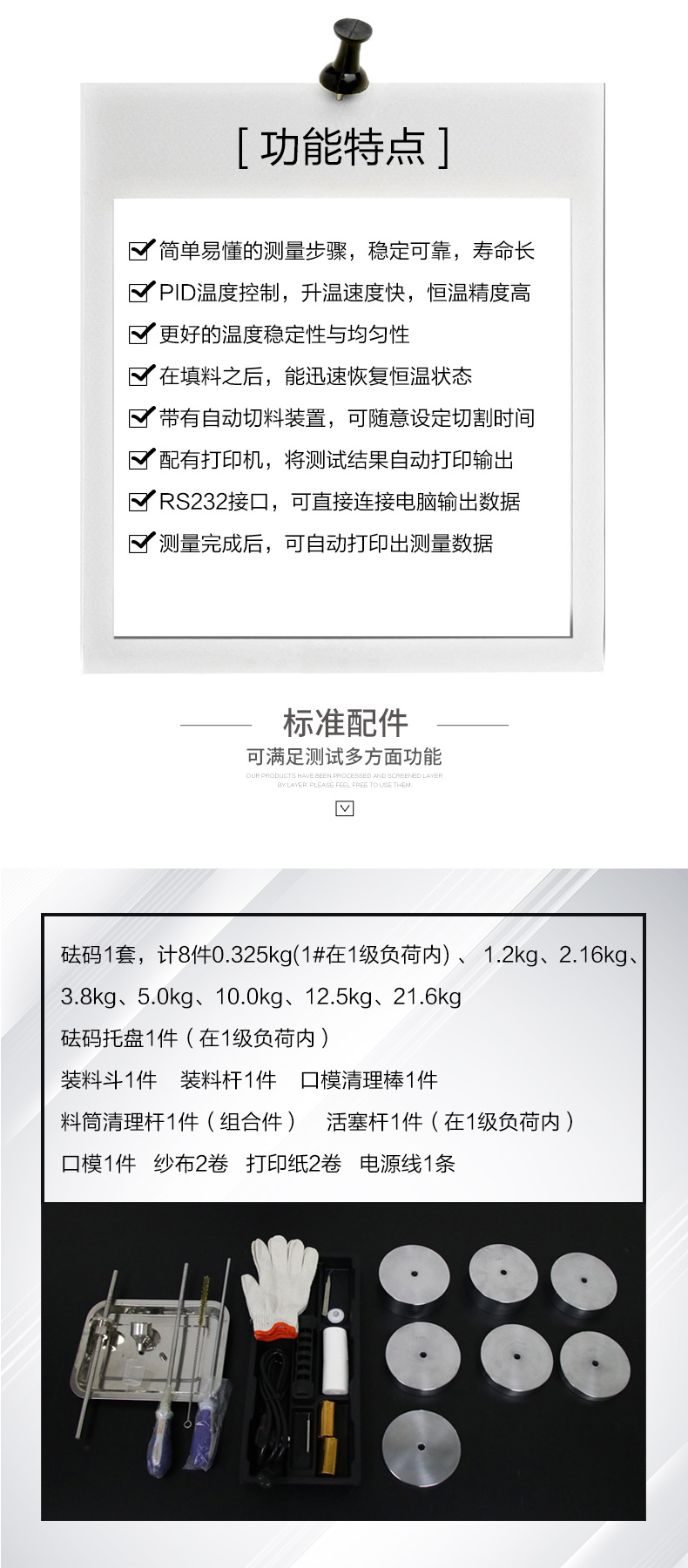 3.料筒清理?xiàng)U1件(組合件),打印紙2卷,紗布2卷,電源線1條,裝料桿1件,活塞桿1件(在1級(jí)負(fù)荷內(nèi)),口模1件