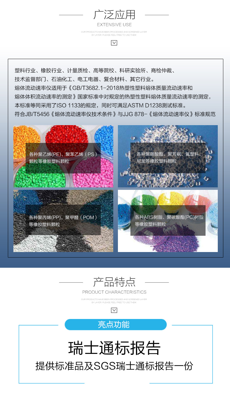 4.內(nèi)置多款塑膠材料熔融指數(shù)測(cè)試條件,方便客戶隨時(shí)調(diào)取使用,減少繁瑣的工作量,并儲(chǔ)存一次測(cè)試條件和結(jié)果。