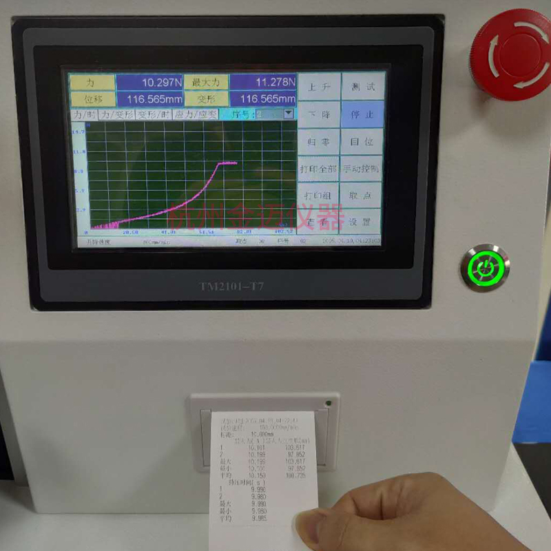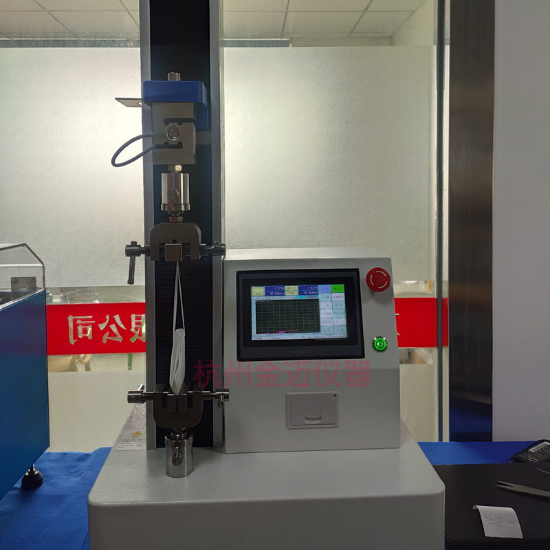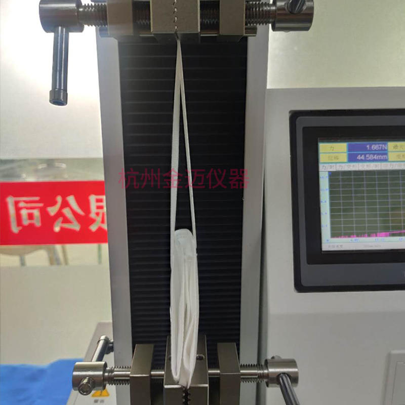 《YY 0469醫(yī)用外科口罩》標(biāo)準(zhǔn)中規(guī)定,口罩帶與口罩連接點處的斷裂強度應(yīng)不小于10N,檢測該項目可以使用金邁儀器的HT-101PT-05系列智能型口罩面帶耳帶拉力試驗機,觸摸屏控制,配置專業(yè)的測試夾具,進(jìn)行口罩或口罩帶與連接處的拉伸強度、拉伸斷裂力的檢測。